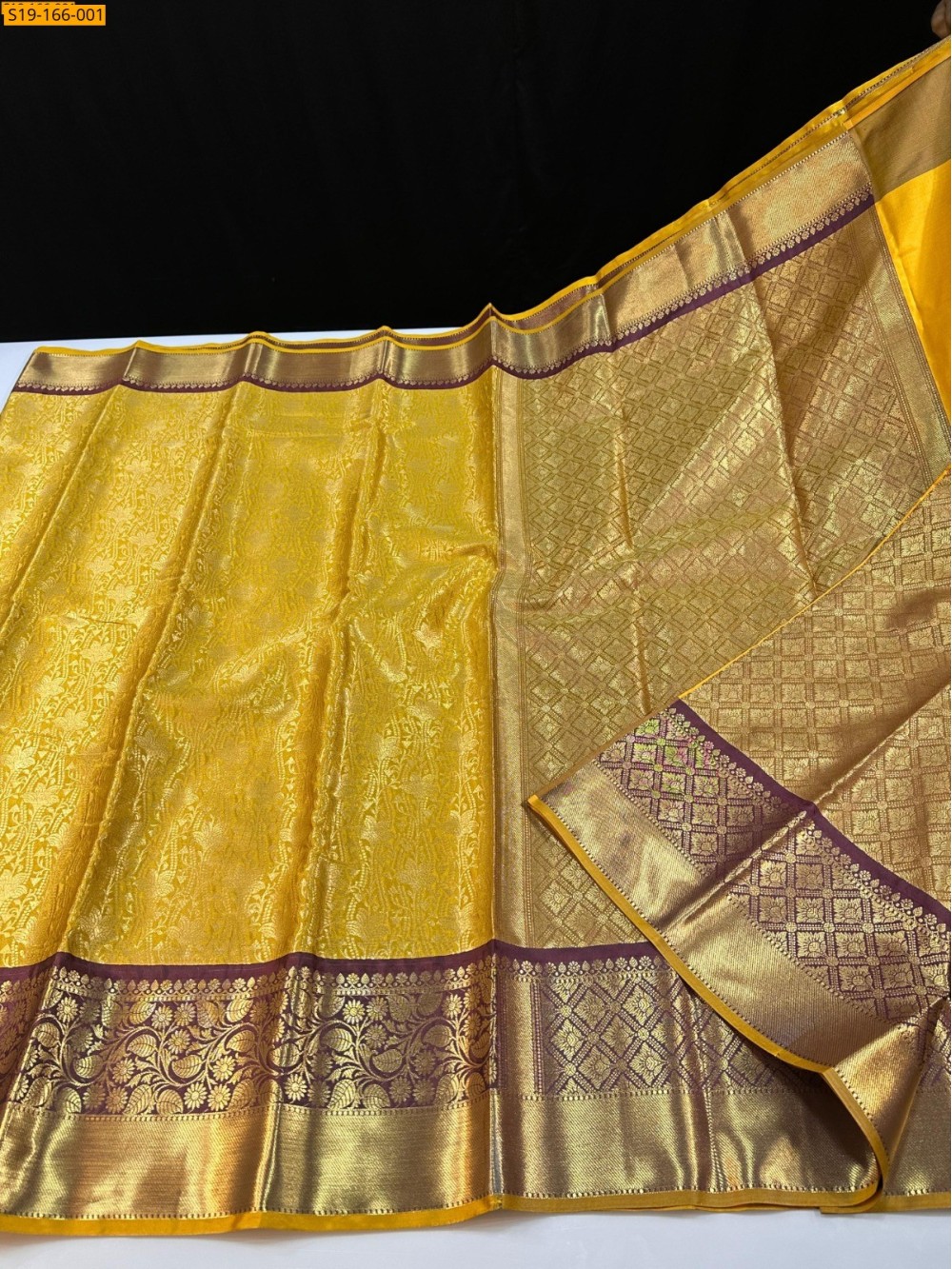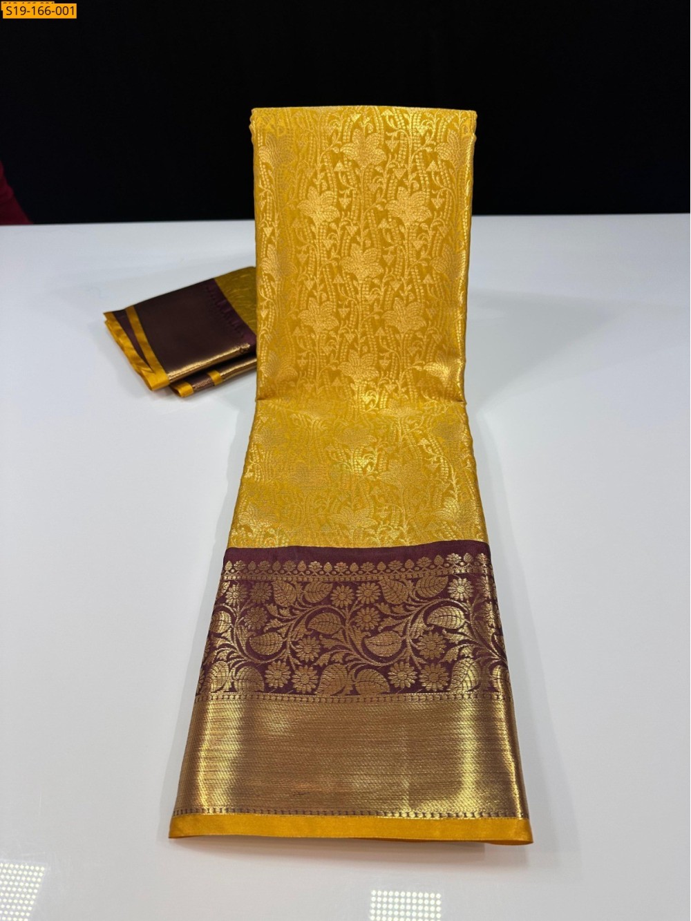 • Golden zari weaving contrast one side big one side small border