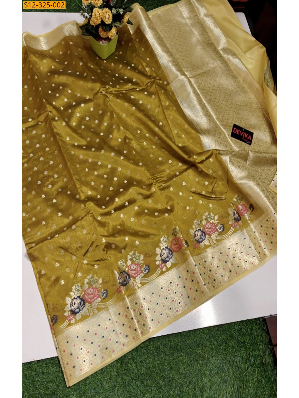 - Full body golden zari weaving small buti Alfe design