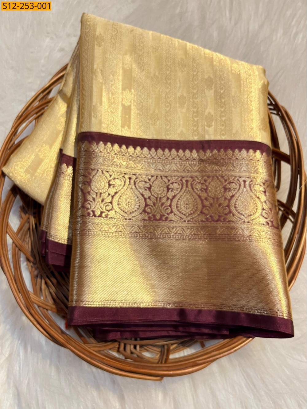 - Golden zari weaving contrasts one side big one side small wine color border