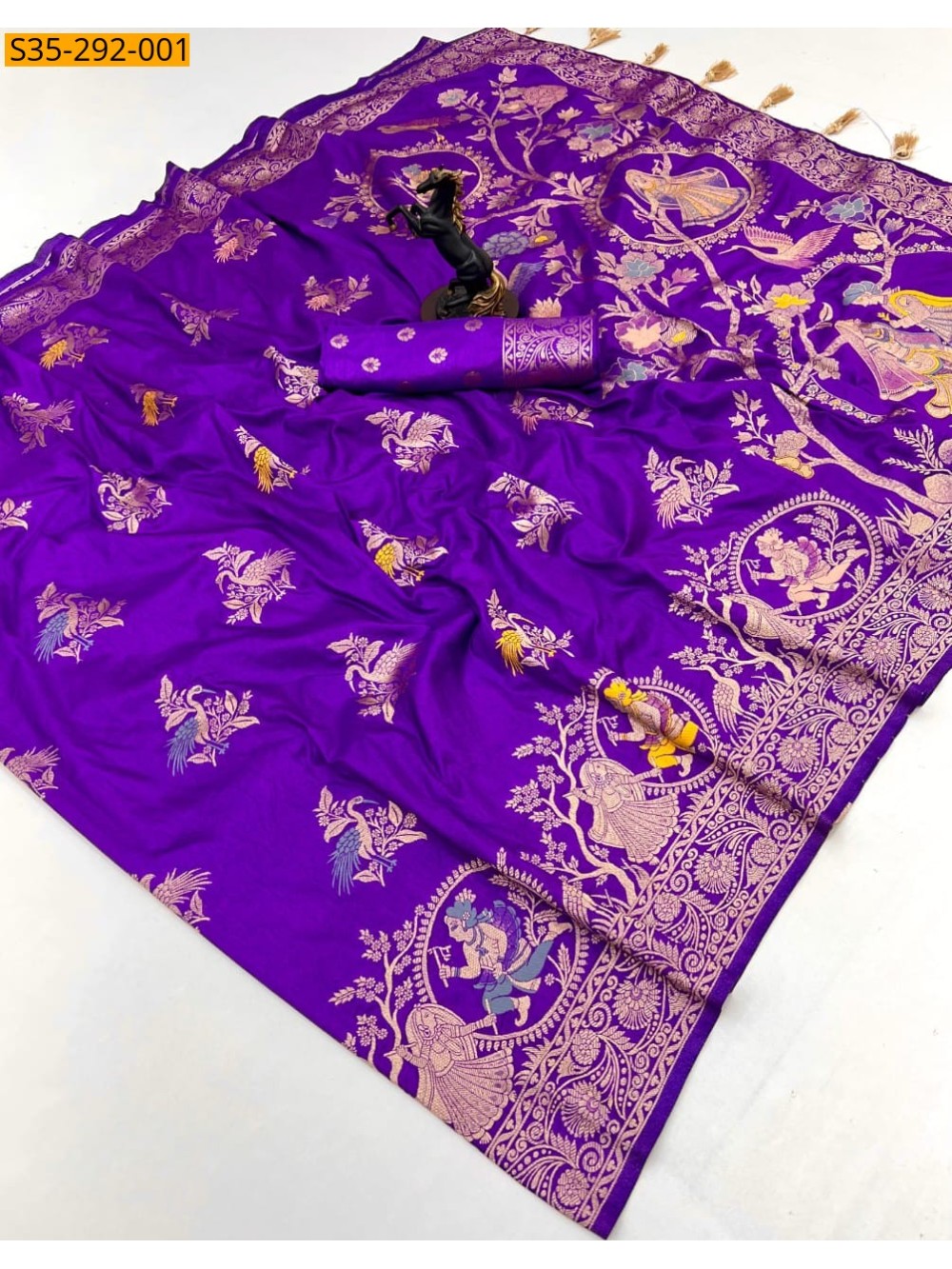 - mythological scenes, peacocks & floral motifs woven all over the body