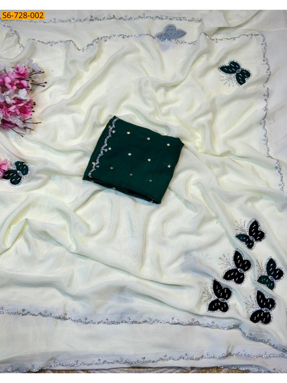 White Chinnon with butterfly work Saree