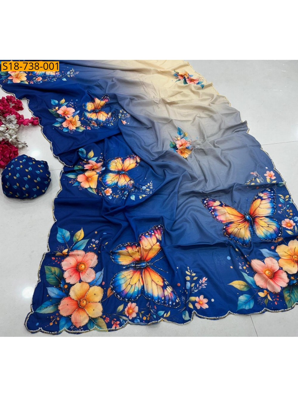 - With beautifull digital butterfly & flower printed Hand Cutdana Work allover the saree