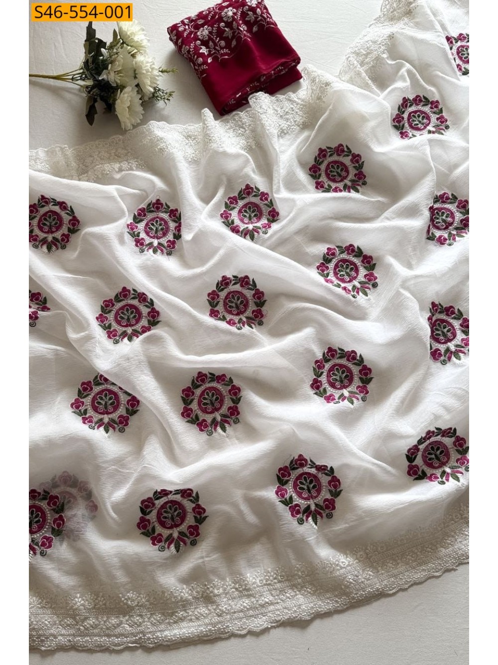 - Floral embroidery design all over the saree