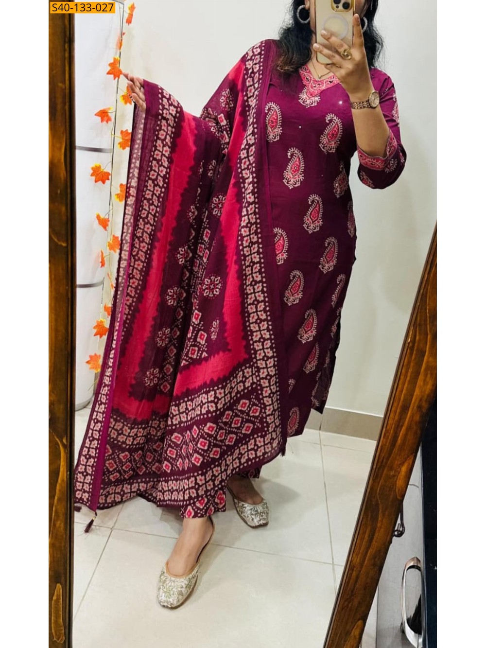 Magenta Pink Fancy Azrakh cotton kurta 3 piece suit set