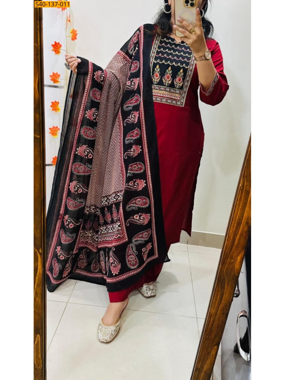 Maroon Fancy Azrakh cotton kurta 3 piece suit set