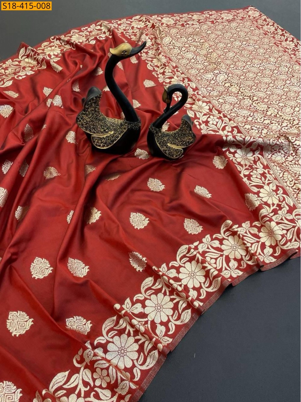 - Intricate golden zari weaving design all over the body