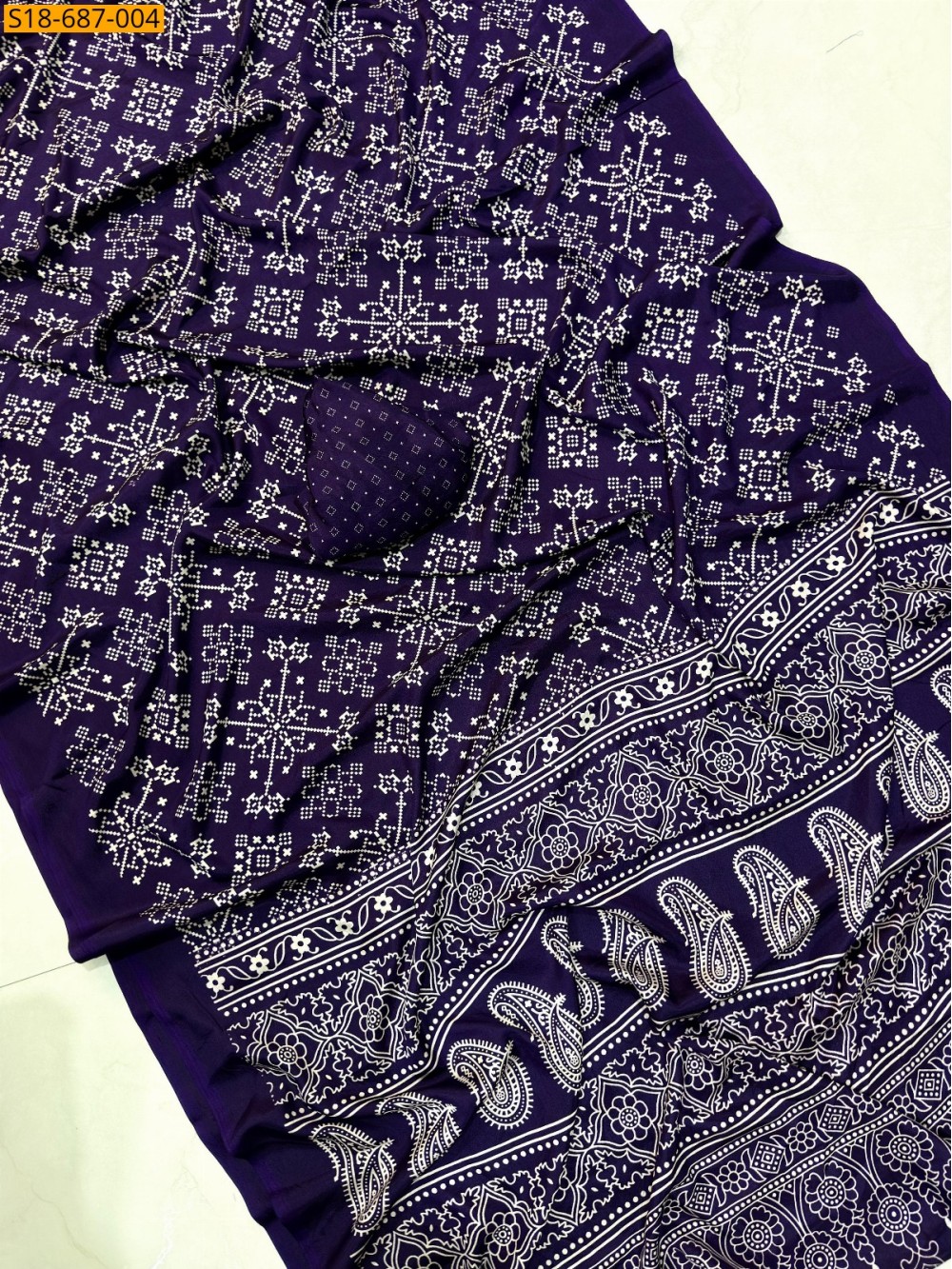 Navy Blue Fancy crape Ajrakh Printed Sarees
