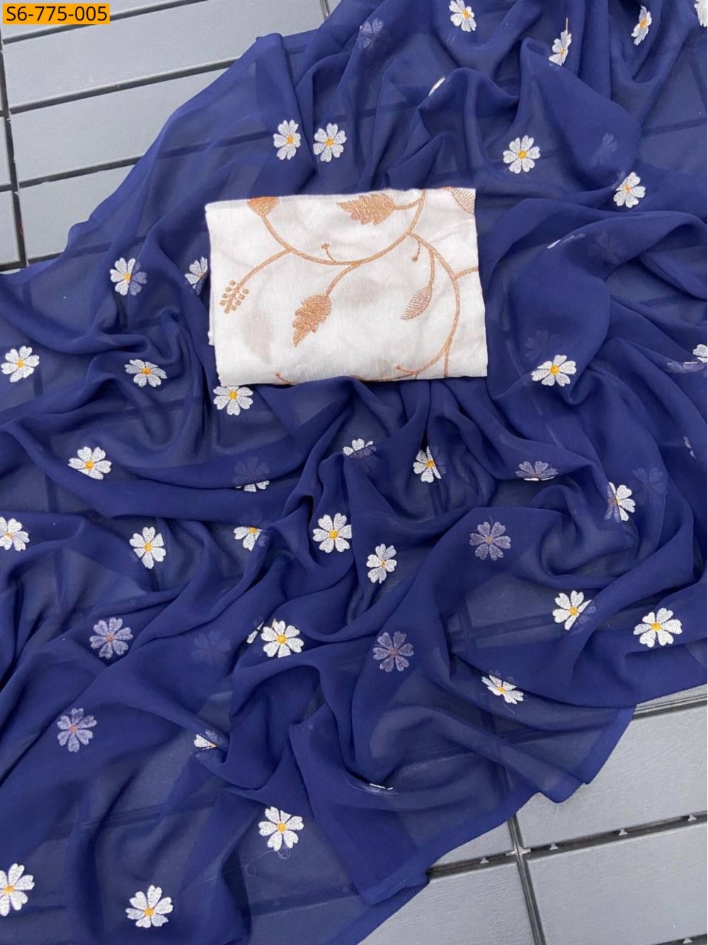 • Floral embroidery design all over the saree