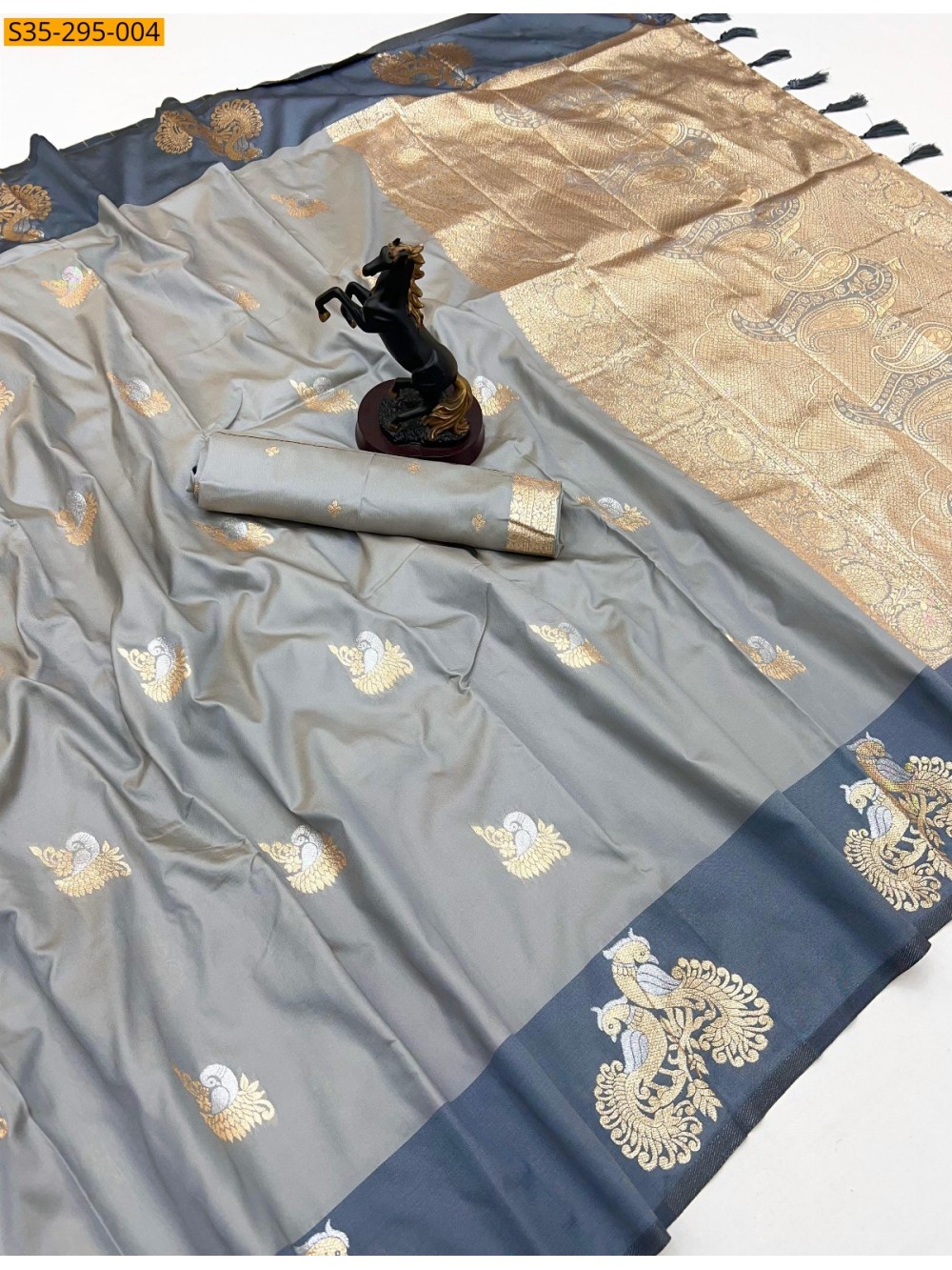 • Rich zari weaving and elegant peacock motifs design all over the saree