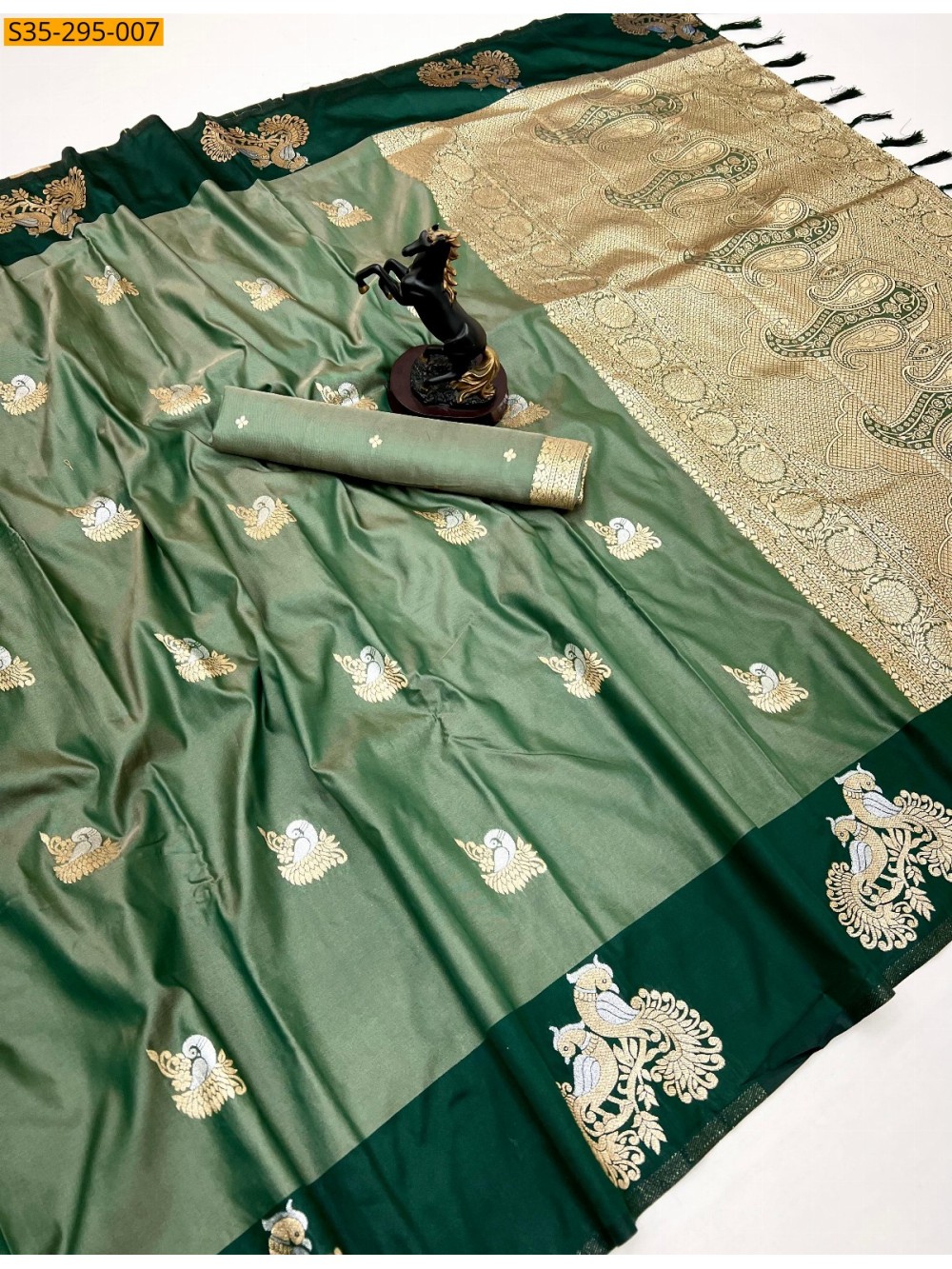 • Rich zari weaving and elegant peacock motifs design all over the saree