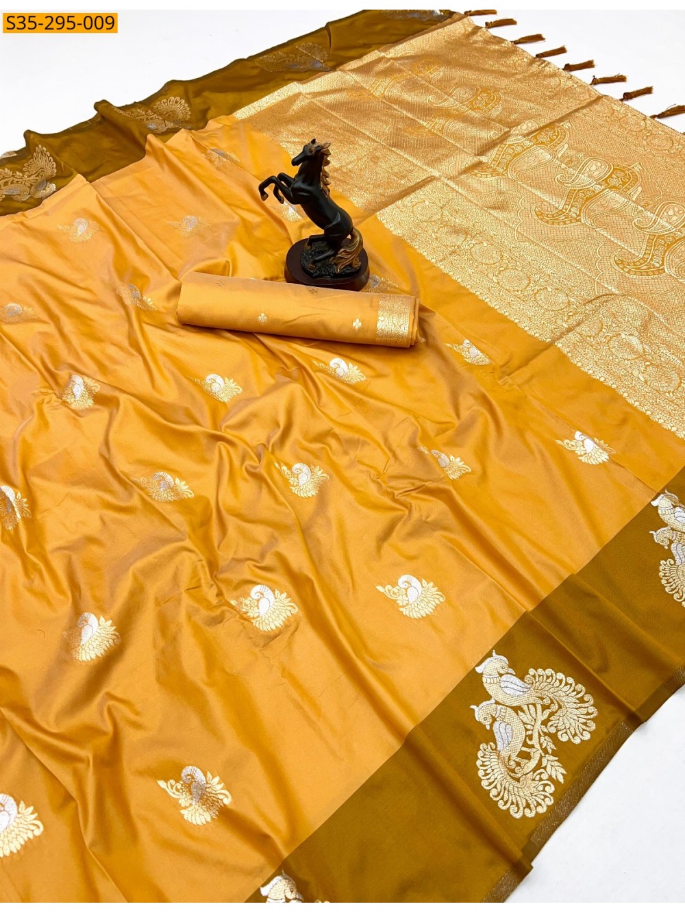 - Rich zari weaving and elegant peacock motifs design all over the saree