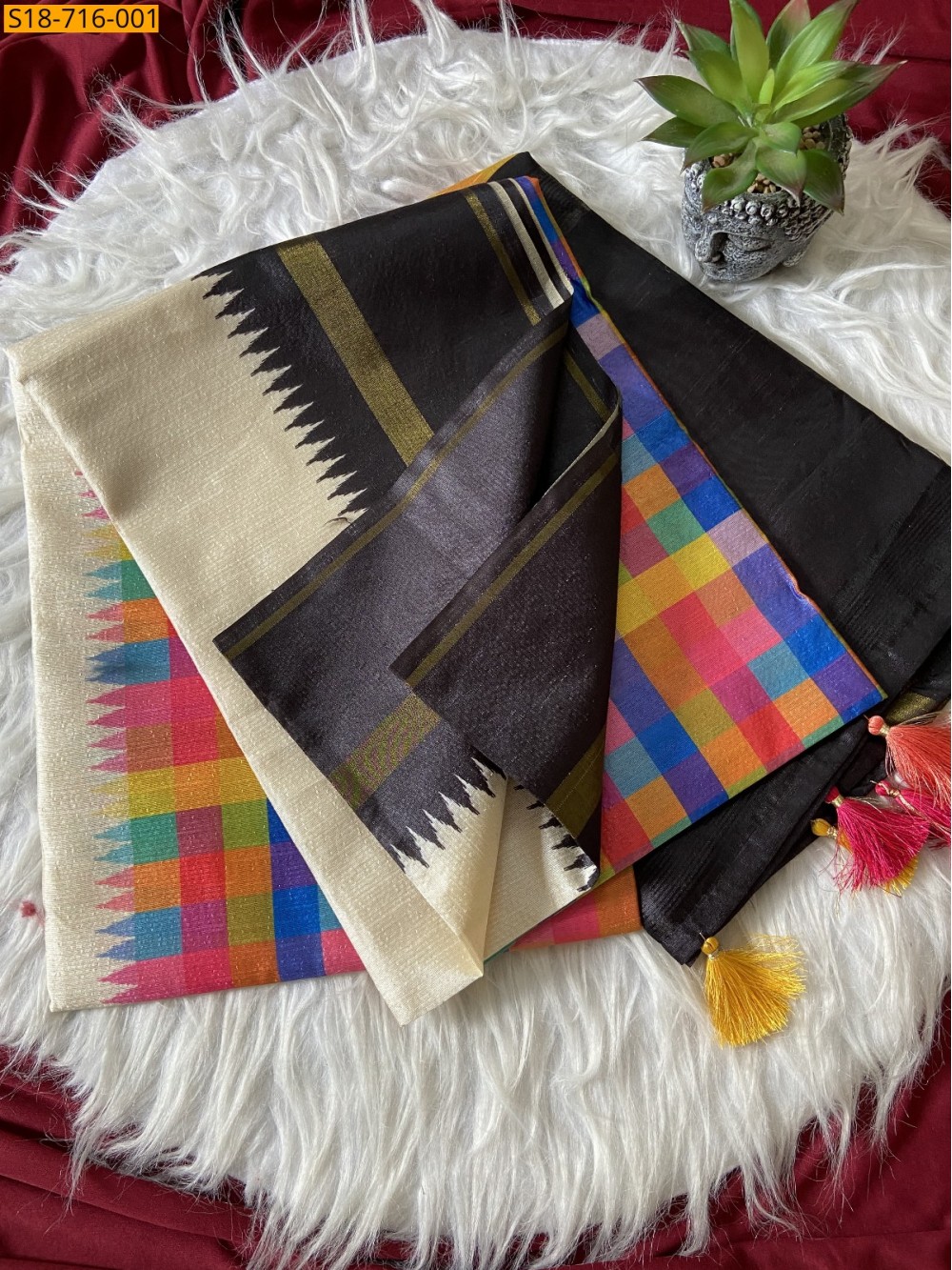 - Contrast pallu with tassels
