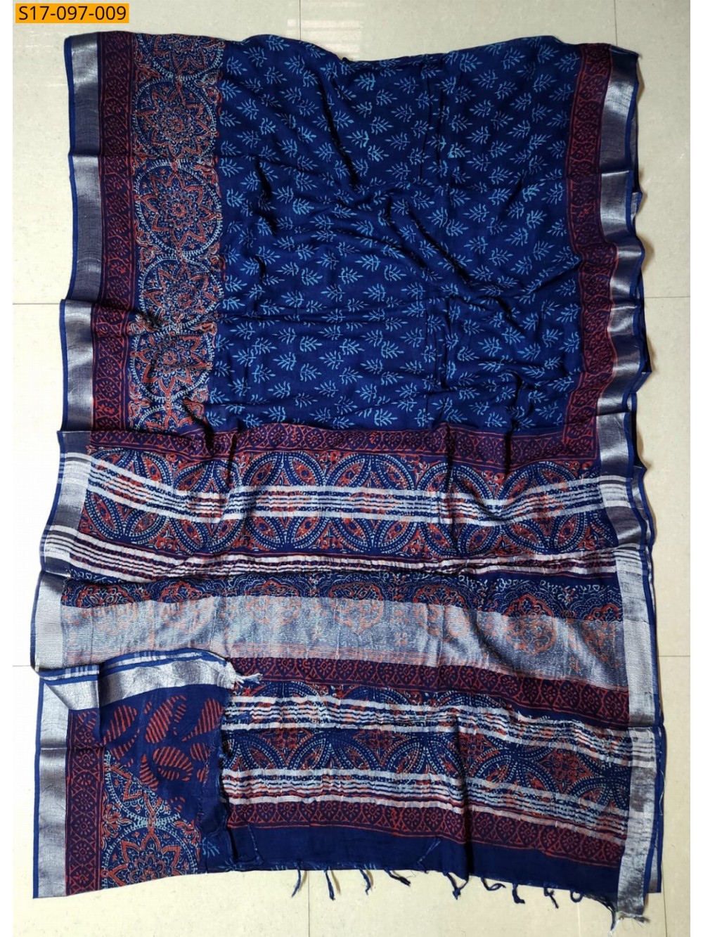 - Handblock print linen cotton saree