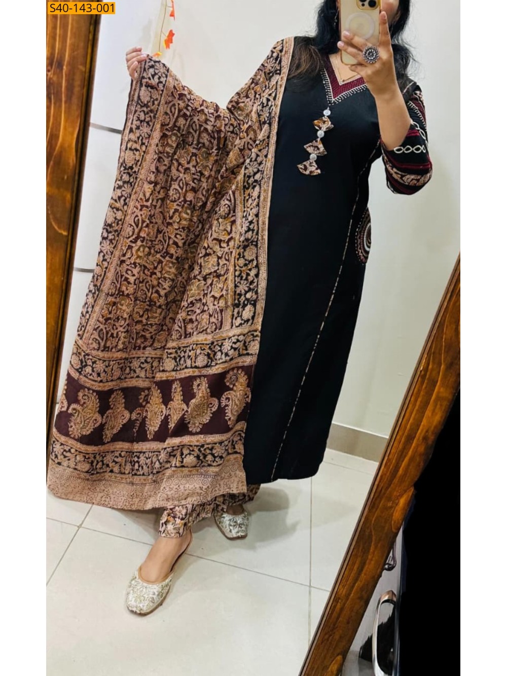 Black Fancy Kalamkari Dhabu Cotton 3 piece suit set