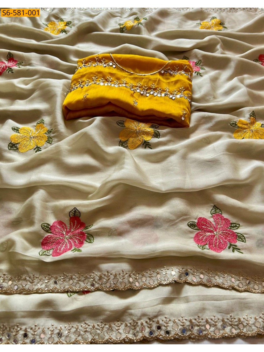 - Floral design all over the saree