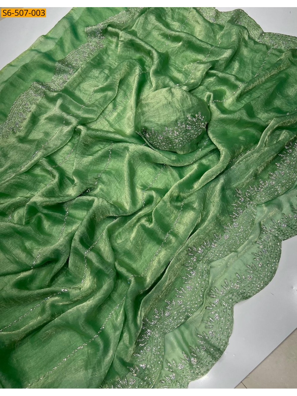 Green Fendy Chiffon Jarkhan Diamond Work Saree