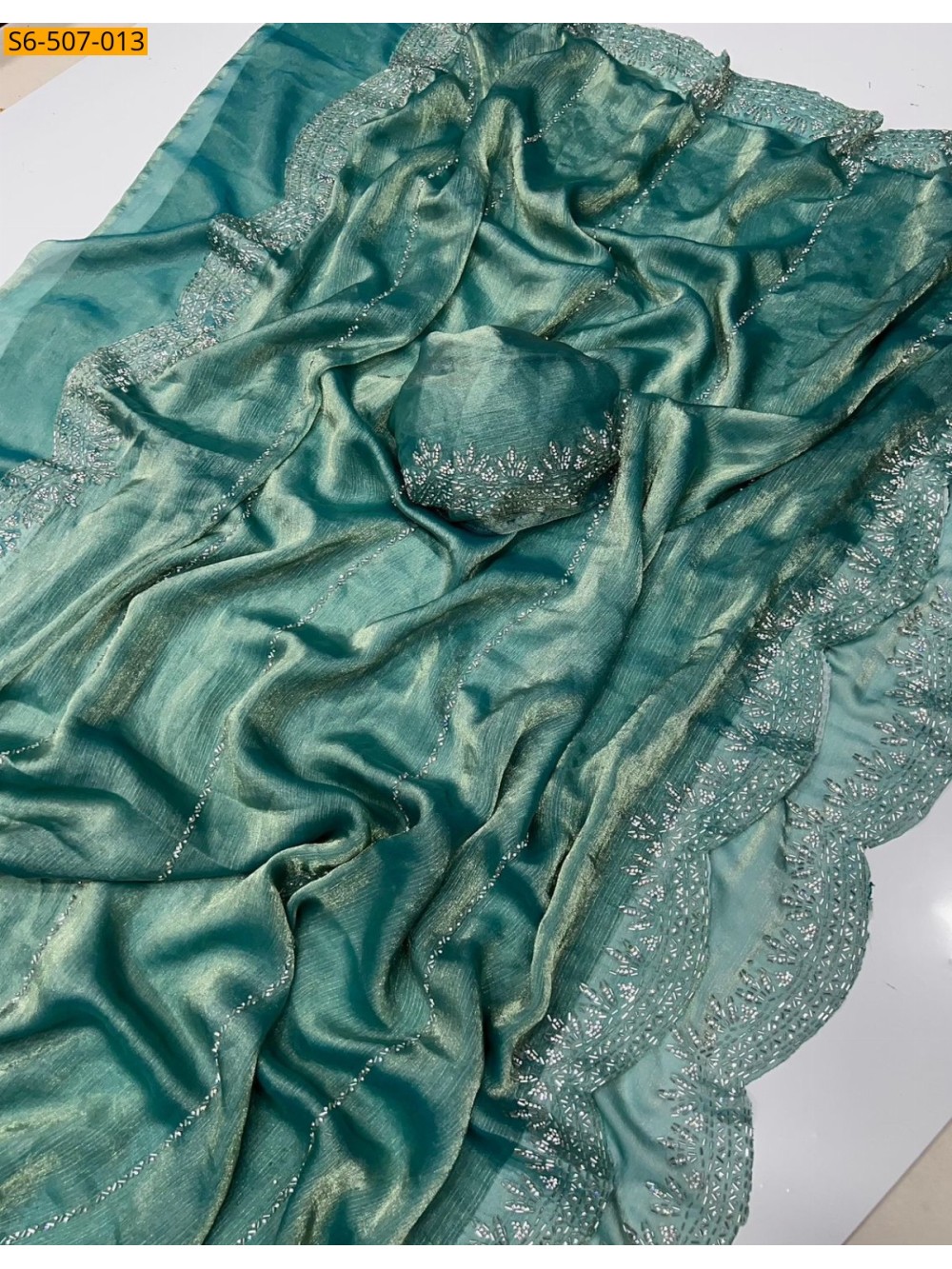 Blue Fendy Chiffon Jarkhan Diamond Work Saree
