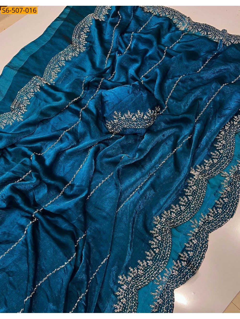 Blue Fendy Chiffon Jarkhan Diamond Work Saree