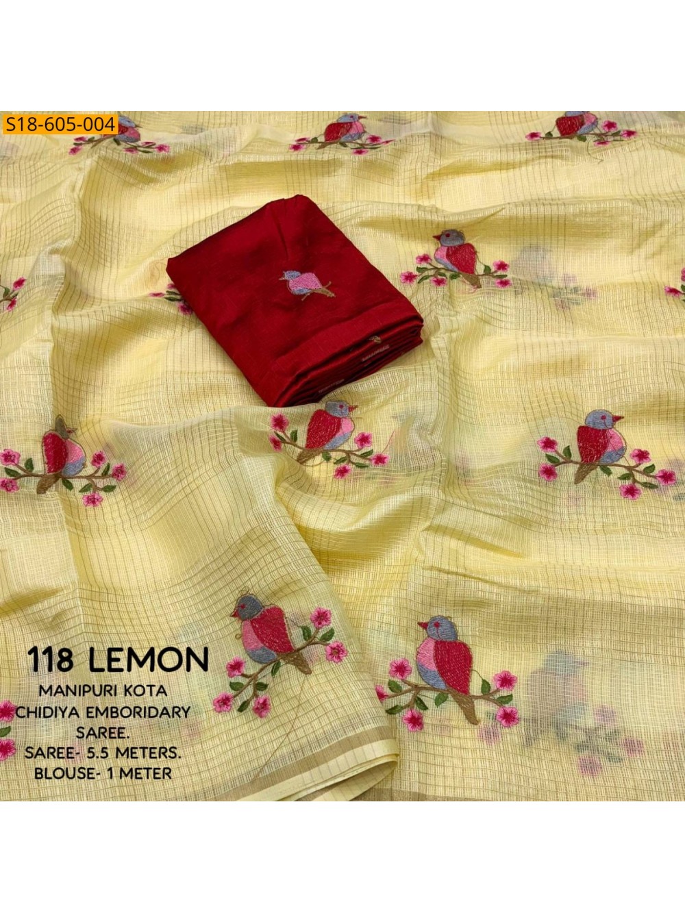Lemon yellow Manipuri kota checks embroidery Sarees