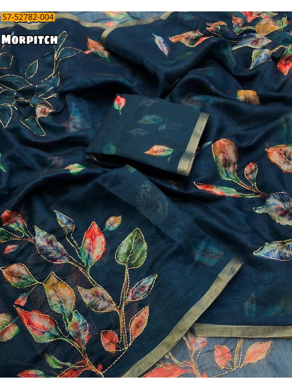 - Soft chenderi floral leaf design digital print with embroidery & cutdana arka outline