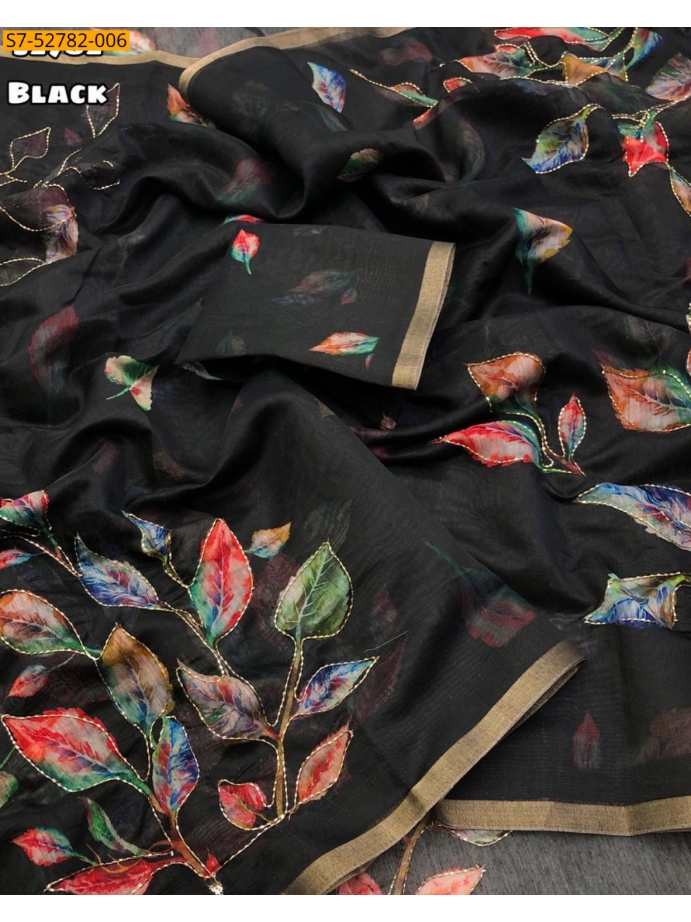 - Soft chenderi floral leaf design digital print with embroidery & cutdana arka outline