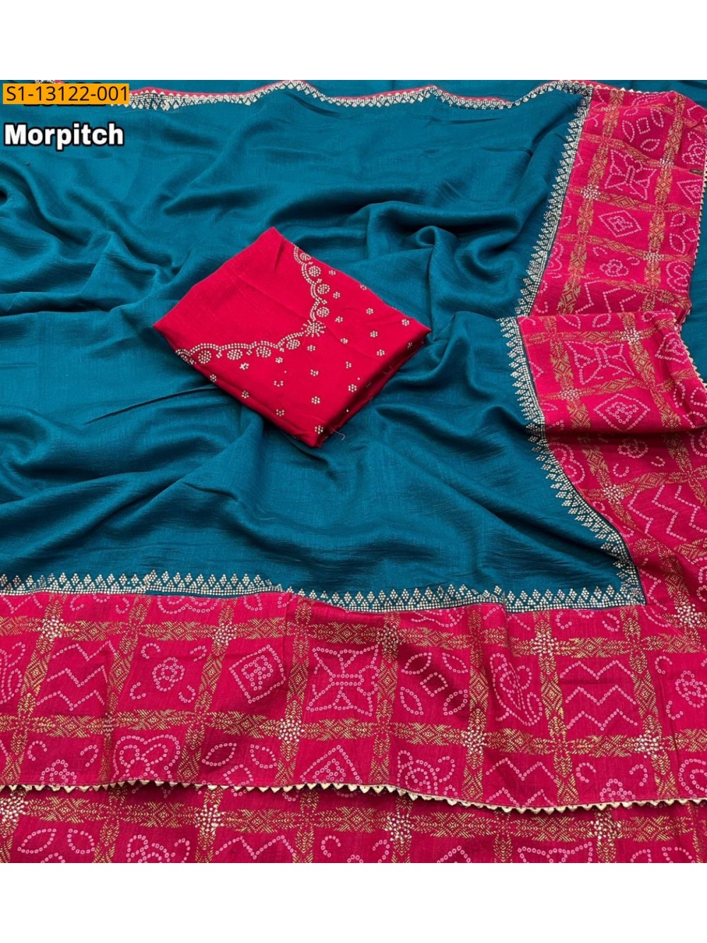 Morpitch Vichitra silk with bandani printed Sarees