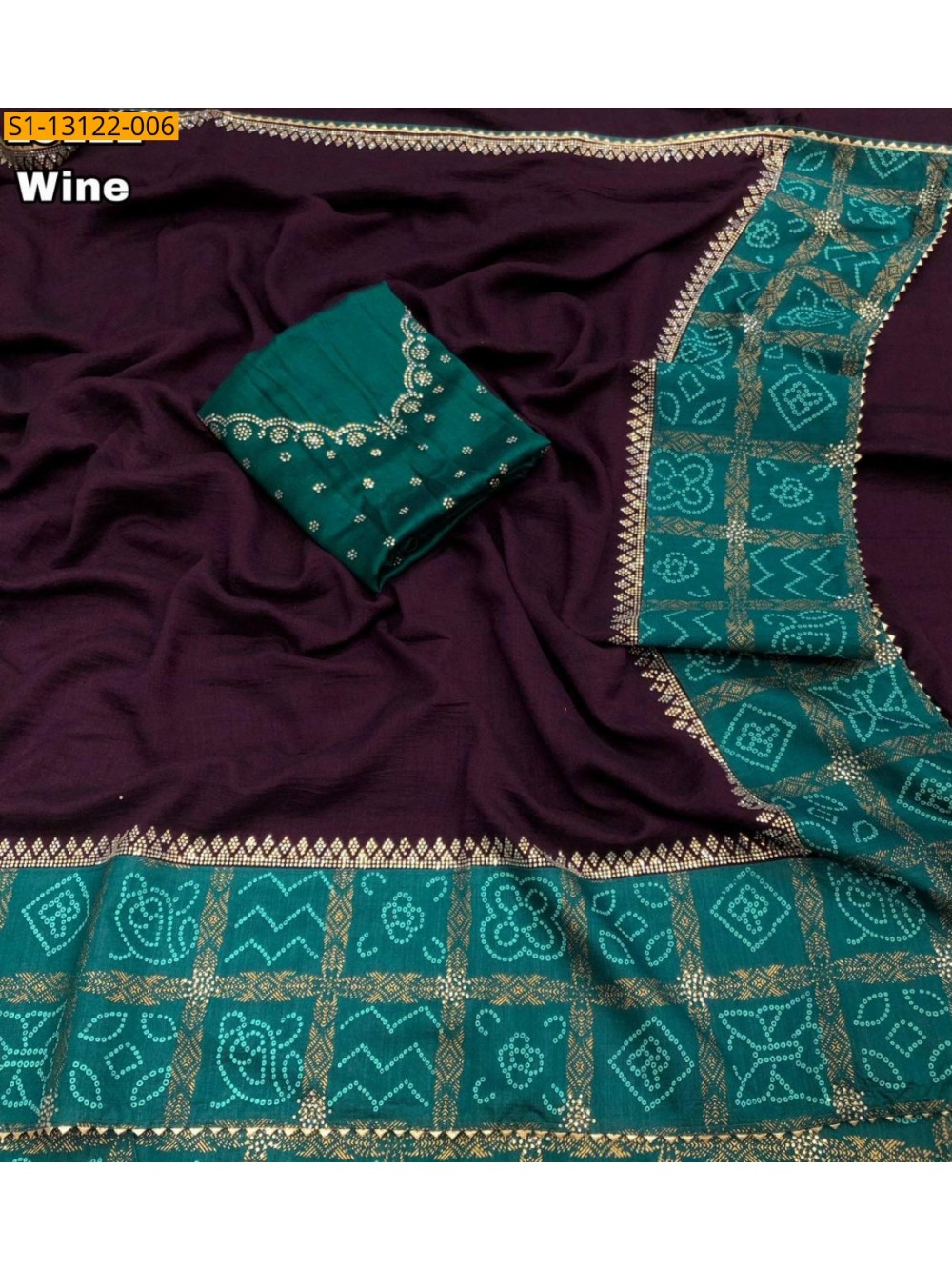 Wine Vichitra silk with bandani printed Sarees