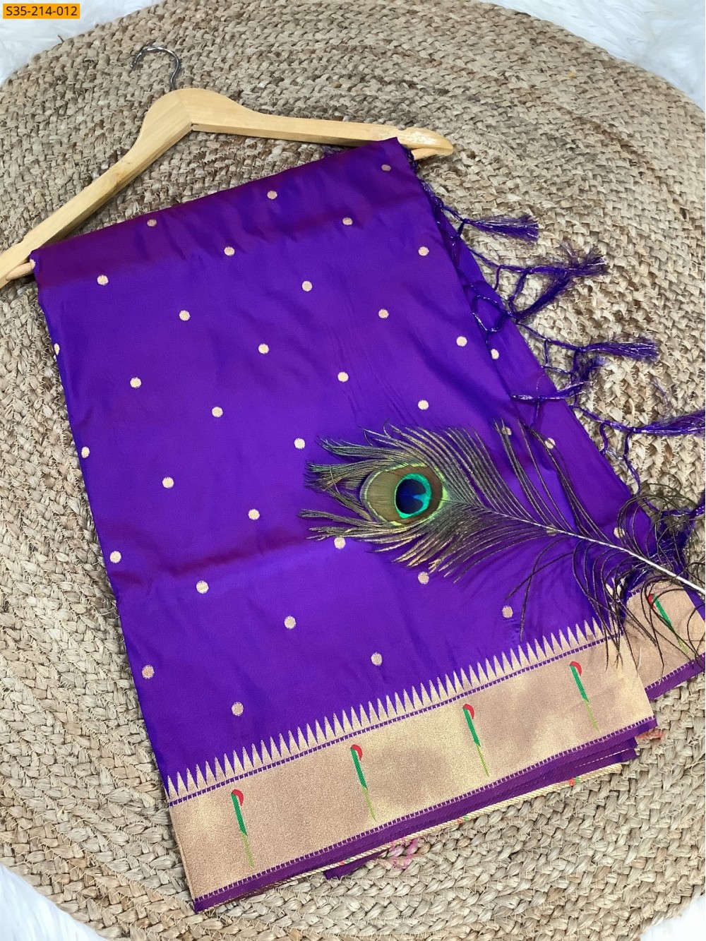 • Golden zari weaving mina and peacock border