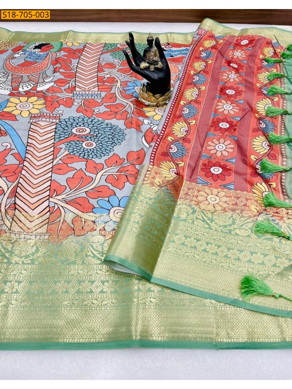 - Kalamkari printed pallu with tassels