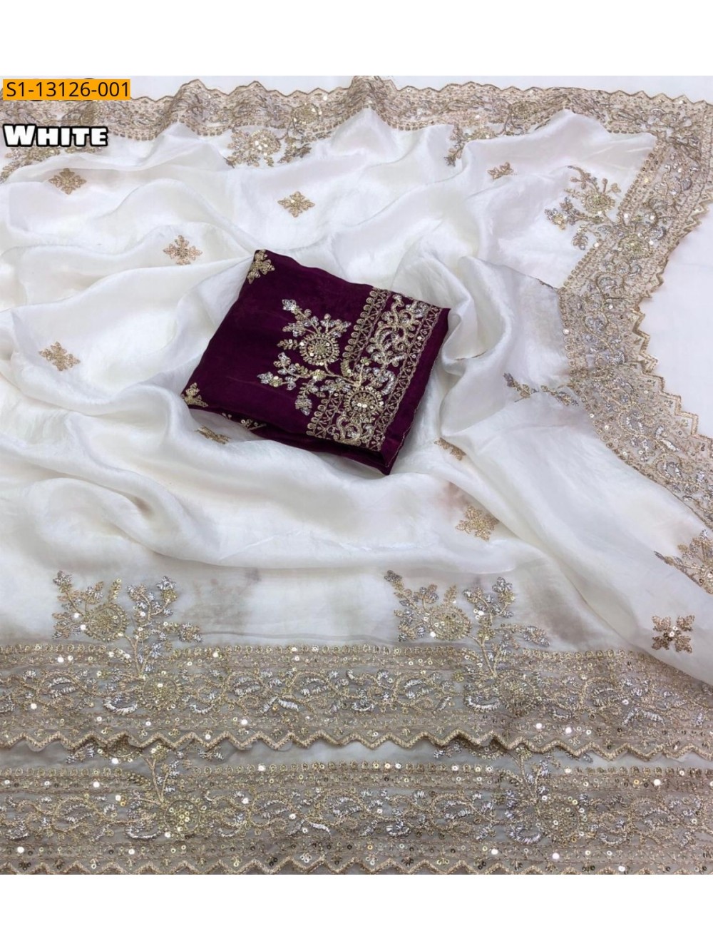 • Gold zari embroidery & sequence work all over saree